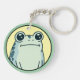 Cute round keychain of a funny green cartoon frog with big eyes and a deadpan look on his face on a yellow and green background.