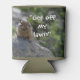 Funny angry looking ground squirrel with internet meme slogan "Get off my lawn" on can cooler.