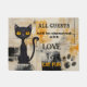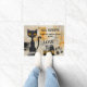 Funny doormat featuring a cute black cat on a grunge painted background in ochre, ivory and black, with a paw print.