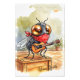 This whimsical watercolor and ink illustration features a charismatic anthropomorphic fly dressed as a bandit, passionately playing a small acoustic guitar. With oversized glossy amber eyes, a fuzzy black body, and a bright red paisley bandana, the character blends humor with artistic charm.
