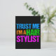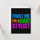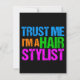 A funny card for a beautician who just graduated from cosmetology school and cuts hair in a salon. A little hair stylist humour. Trust Me, I'm a Hair Stylist written in fun, bright neon colours.