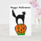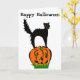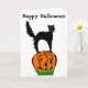 A funny scared black cat standing on top of a pumpkin with a carved face. Card inside reads Happy Halloween.