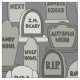 Get ready for some spooky fun with the Halloween gravestones on this fabric. Gravestones have names like "I.M. Scary", "Autumn Webb", "Candy Ghoul", "Wolf Howl", Jack O. Lantern", and more, in shades of grey. Original art © Anne Coffey.