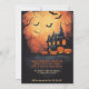 The Halloween party invitation features a spooky scene with a haunted house positioned on the right side of the card. The haunted house is dark and dilapidated, with eerie glowing windows and a few Jack-o'-lanterns with mischievous grins placed around its front steps. On the left side of the card, a few bats are circling in the moonlit sky, adding to the creepy ambiance.