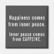 Funny and modern grey and white magnet for the kitchen defines what and where happiness and inner peace really come from. Text reads: Happiness comes from inner peace. Inner peace comes from caffeine.