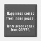 Funny and modern grey and white magnet for the kitchen defines what and where happiness and inner peace really come from. Text reads: Happiness comes from inner peace. Inner peace comes from coffee.