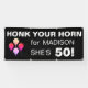 Designed with customizable black background and festive pink and purple balloons. Funny phrase "Honk Your Horn for" followed by customized name and "She's 50" in big bold white block lettering.