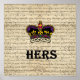 Fun funny "hers" text with a purple crown illustration on a vintage paper handwritten background.
