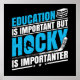 Funny hockey themed throw poster with blue and white text on a black background reads Education is Important But Hockey is Importanter!