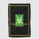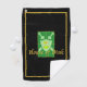 Funny sports towel with a mediaeval style crest design for pickleball players, has crossed swords on shield with pickleball court, and "House of Dink" gold text and border on black background