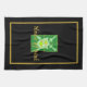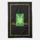 Funny kitchen towel with a mediaeval style crest design for pickleball players, has crossed swords on shield with pickleball court, and "House of Dink" gold text and border on black background