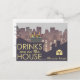 Creative cartoon style invitation design for a housewarming party to celebrate someones new home. Drinks tub with bottles is shown on top of the house. Please personalise text.