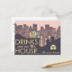 Creative cartoon style invitation design for a housewarming party to celebrate someones new home, Drinks are on the house quote incorporated in the Design. Cocktails are shown on top of the house. Please personalise text.