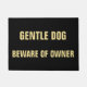 "Gentle Dog, Beware of Owner" Funny, hilarious, humourous warning, faux gold script on black, non-slip rubber backing, covered outdoor / indoor / entrance door mat. A fun door mat for dog owners, for the entrance to your property - farm house - business premises. Adds humour to your home decor.