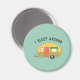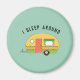 Funny fridge magnet has "I sleep around" customisable text with cute yellow and green retro style RV camp trailer on green background . Perfect for those that love the lifestyle of RV camping in campsites, rv parks and remote off the grid spots- where parking your rig in multiple places for days, weeks or months is just a way of life.