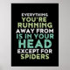 Funny and humourous inspirational and motivational quote poster about being brave and conquering your fear. Everything you're running away from is in your head. Except for spiders. Spiders are always real. Background colour can be customised to your desired colour.
