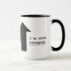 A funny black and white mug that says: I'm with stupid with a red chevron underscore spell check alert under the misspelled word stoopid, and an arrow pointing to the person taking a drink.