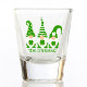 Funny personalised shot glass featuring three cute Irish gnomes clad in green and shamrocks. Add your name in green Celtic-style typography.