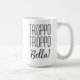 Funny Italian Saying mug with the words "Troppo Troppo Bella", which means "Too, Too Beautiful" Simple black san serif and script on a white mug. Personalisation is easy. A pretty script is vertically placed on the front centre of the mug for entering your name. Great gift that will make your Italian friends smile!