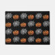 Funny trendy doormat with orange jack o lantern and white spiderweb design on black background . Perfect for a Halloween party or spooky season home decor.