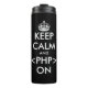 Funny keep calm and code on thermal travel tumbler mug. Keeps drinks warm or cool. Make your own custom funny keep calm and carry on parody. Modern typography template with crown. Customizable drink ware for home, office, hiking, sports etc. Cool Christmas or Birthday gift idea for co worker, employee, friend, family, boss, colleague etc. Black and white or custom colors.