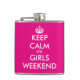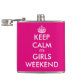 Funny keep calm its girls weekend hip flask. Personalised pink keep calm hip flask for women. Make your own funny keepcalm parody for girls night out, bachelorette party, Birthday etc. Custom Keep calm and carry on spoof. Humourous Birthday or wedding gift idea for bride and bridesmaids. Vintage keepcalmandcarryon slogan with little crown.