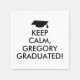 These customisable keep calm disposable paper napkins for a graduation party or event have an image of a graduation cap instead of the keep calm crown logo. It says Keep Calm, Gregory Graduated!
