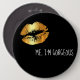 Funny button with faux golden lips on a black background showing a kiss and in white the text 'Kiss me I'm gorgeous'. Great to wear on a bacherlorette party!