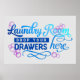 The words "Drop Your" and "Drawers" are in block text in medium blue, and are placed in two rows below "Laundry Room"