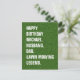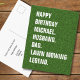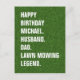 A bold Lawn Mowing Legend birthday postcard featuring clean white typography set against a realistic grass background.