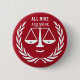 Lawyer gift button or graduation party favors featuring cartoon scales of justice and creative quote.