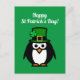 Funny leprechaun penguin St Patrick's Day postcard. Green cartoon design with lucky clover aka shamrock. Fun for kids and adults.