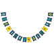 Throw a monstrously cute birthday party for little boys with personalised party supplies. This bunting is ready to be customised with your own greeting and features cute illustrations of goofy cartoon monsters in shades of yellow, teal and aqua blue against navy blue background.
