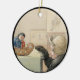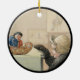 Cute little boy in his winter hat and coat looking at a toy man in a boat. Fine art by Swedish painter Carl Larsson.
