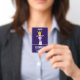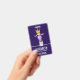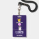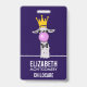 Name badge with a whimsical llama blowing a big pink bubble. Wearing a gold crown and a black bow tie. Dark purple background.