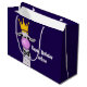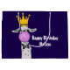 A personalised birthday gift bag (large size) with a whimsical llama blowing a big pink bubble while chewing gum. Wearing a gold crown and a black bow tie. Dark purple background.
