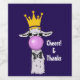 Cheers & Thanks bottle label with a whimsical llama blowing a big pink bubble. Wearing a gold crown and a black bow tie. Dark purple background.