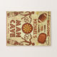 Create your own humourous, custom "man cave" puzzle using this easy DIY template. Made to look like the wall of a cave, the puzzle has primitive drawings of men throwing darts, a dart board, a TV, a football, two baseball bats, two baseballs, two pretzels and a couple retro beer bottles. The puzzle can be easily personalised with your name and the year your home bar or "man cave" hideout was established. The whole design is in shades of brown, yellow and a little red.