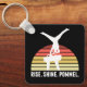 This cool mens gymnastics keychain features a male gymnast in a handstand on a pommel horse in front of a beautiful sunset. The funny quote reads RISE SHINE POMMEL.