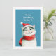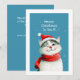 "A Meowy Christmas To You!” Says a cute little winking cat that decorates this cheery Christmas card, wishing a very meowy Christmas to all. Snow is beginning to fall as the blue sky begins to fade in the late afternoon light, and the darling kitty shows off a bright red Santa hat and scarf. The design originated as a fun retro watercolor image.