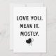 Simple, honest, and irresistibly charming—this “Love You. Mean It. Mostly.” design pairs playful humor with a clean, minimalist aesthetic. Featuring bold hand-drawn lettering and a sweet little character holding a heart, it strikes the perfect balance between affection and wit.