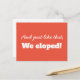 A funny minimal typography design in orange and white with a cool text pairing that says: And just like that, We eloped! with a text template on the back for you to add your custom text in matching orange and white colours inverted. #justmarried