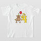 Cute and funny monkey wearing a birthday hat holding a banana and red balloon standing next to a huge number 4 on fourth birthday t-shirts, hoodies, buttons, stickers, totebags and more.