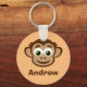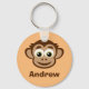 Funny monkey head cartoon personalised kid's keychain. Add personalised name or quote. Cute key chain gift idea for children. Cute chimp face drawing. Suitable for girls and boys. Custom background colour.