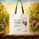 Funny More Vino Please Wine Themed Bridal Shower Tote Bag - Perfect for a wine themed bridal shower gift or bachelorette party welcome bag. This elegant and minimal wine themed tote bag is perfect for wine lovers. It features a single wine glass with red wine with black script and block font. The funny saying "More Vino Please" a variation of More Wine Please. Customise this editable tote bag with your own event details. Make a great gift or prize for bridal shower games, bridal shower favours or bachelorette party souvenir bags.