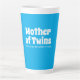 Funny modern latte mug for Mother's Day or any day to honour special moms! Bright blue background with white text that reads "Mother of twins. There may be wine in here"