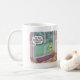 Funny Mug of dog who wants outside for a smoke. A little dog stands at the backyard sliding door with a lighter and a cigarette in its mouth just about to light up. A voice balloon comes from off screen saying, "The Dogs Wants Out Again".