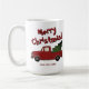 Funny mug with old red truck and Christmas tree . Old vintage Chevy truck hauling a Christmas tree. Fun coffee cup design for the holidays. Personalize with your own custom text and colors.