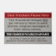 Door Knockers Please Note. This household charges $50 per minute to listen to sales pitches, religious messages, and fund raising stories. This charge is payable in advance. By knocking you signal your agreement. This is a great way to get rid of those pesky door knockers in a clever way. It will also make your friends and family laugh. This makes a great house warming gift!