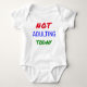 "NOT ADULTING TODAY" is the humourous text on this baby bodysuit. It has bright red, blue and green colours, and a doodled face on the 'O' of NOT.